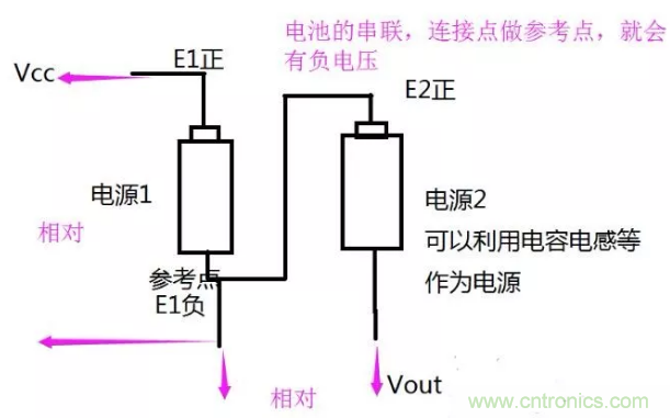 想產(chǎn)生負電壓,就讓他相對于電源負極的電勢更低即可。要想更低,必須有另一個電源的介入,根本原理都是利用兩個電源的串聯(lián)。電源2正極串聯(lián)在參考電源1的負極后。電源2負極就是負電壓了。