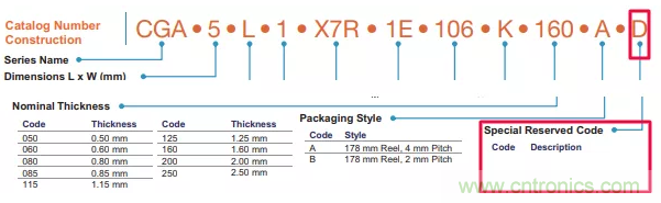 對(duì)于TDK的汽車(chē)級(jí)CGA系列的電容來(lái)說(shuō),環(huán)氧樹(shù)脂安裝的電容只在后綴上以一個(gè)字母"D"表示,這一般定義為“TDK內(nèi)部代碼”,并可以有其他字母如“A”、“B”、“C”、“E”等。