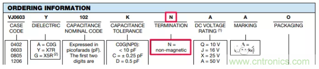 對(duì)于Vishay(威世)的VJ系列的電容器,有兩種不同的零件編號(hào)方案需要注意——老的和停產(chǎn)的零件編號(hào)方案將環(huán)氧樹(shù)脂安裝選項(xiàng)指定為“N”選項(xiàng)。