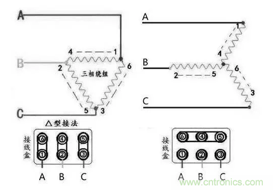 首先我們看下電機的內(nèi)部繞組,三相異步電機內(nèi)部有三個繞組,有星和三角形兩種接法。