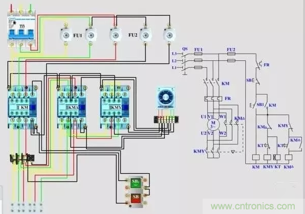 從上圖我們可以看出,剛開始1號接觸器和3號接觸器同時吸合,由于三號接觸器上端是短接到一起的,三個點接為一點,這一個點連接電機的W2,U2,V2,正好是星型接法,這個點叫中性點。星型啟動降低了電壓,減小了電流,電機啟動很輕松。當啟動以后,3號接觸器斷開,2號接觸器吸合,1號是主電源接觸器,一直保持吸合狀態(tài)。1號接觸器和2號接觸器吸合以后,電機的三個繞組就成了三角形接法,電機就可以全電壓正常運行。