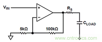 為解決這一問題,運(yùn)算放大器設(shè)計(jì)人員提出了一種解決方案:在放大器輸出端與CLoad引腳之間加裝串聯(lián)電阻器,使器件能夠驅(qū)動(dòng)大于1微法 (µF) 的負(fù)載(圖2)