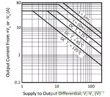 耗散極限不是靜態(tài)輸出功率的單變量函數(shù),它還受工作頻率和壓擺率的影響,這可能導(dǎo)致輸出級過熱。因此,對于任何此類驅(qū)動(dòng)器,研究安全工作區(qū)域 (SOA) 曲線圖都至關(guān)重要。讓我們首先從ADHV4702-1的靜態(tài)SOA開始(圖8)。