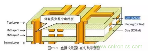 直插式元器件封裝的焊盤一般貫穿整個(gè)電路板,從頂層穿下,在底層進(jìn)行元器件的引腳焊接,如圖所示。