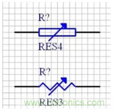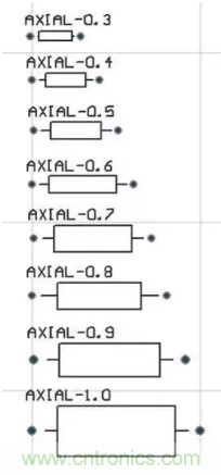 可以選用“RES1”、“RES2”、“RES3”、“RES4”中任何一個(gè),對(duì)應(yīng)的電阻封裝為AXIAL系列,比如“AXIAL-0.3”到“AXIAL-0.7”,其中0.4和0.7指電阻封裝的焊盤間距,一般用“AXIAL0.4”封裝。