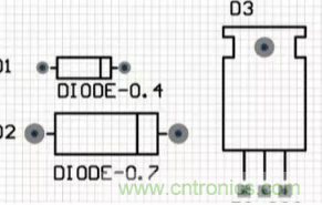 二極管的原理圖符號(hào)為“DIODE”,對(duì)應(yīng)的二極管的封裝為封裝屬性系列,如“DIODE-0.4”(小功率)到“DIODE-0.7”(大功率),其中0.4和0.7指二極管的焊盤間距,一般用“DIODE0.4”。值得一提的是,普通的發(fā)光二極管的元器件封裝為“RB.1/.2”。