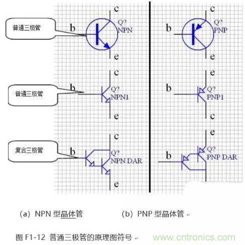 這兩種類型的晶體管外形完全相同,都包括3個(gè)引腳,即b(基極)、c(集電極)和e(發(fā)射極),但是其原理圖符號(hào)卻不一樣,如圖F1-12所示。三極管的原理圖符號(hào)的常用名稱有“NPN”、“NPN1” 和“PNP”、“PNP1”等。