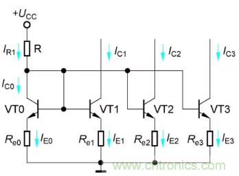 當(dāng)Re0=Re1時,IC1仍然等于IR,但此電路的IR由式(2-4)約定,比式(2-2)的IR小,一般用于前置放大器的輸入級。