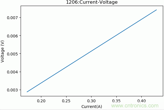 下面分別測試了0603, 0805, 1206三種封裝下,通過的電流和電阻兩端之間的電壓的關(guān)系??梢钥吹饺N封裝的電阻都在電流實際超過6A之后,電壓開始快速上升。
