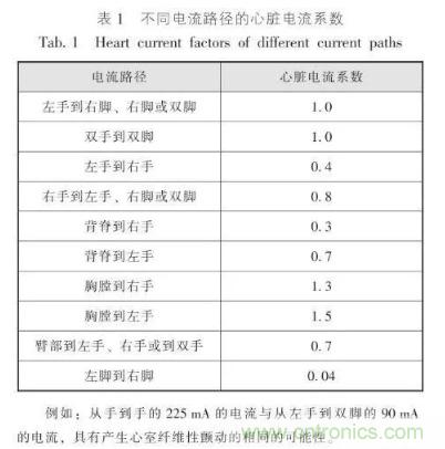 以上所述電擊電流通過人體的通道環(huán)境是在地面上,接觸電流經(jīng)手、腳和不同電位導(dǎo)體接觸,有可能經(jīng)心臟引發(fā)電擊事故。表1是不同電流路徑的心臟電流系數(shù),引自GB / T 13870. 1 - 2008 / IEC / TS 60479 - 1:2005《電流對(duì)人和家畜的效應(yīng) 第1部分:通用部分》表12。