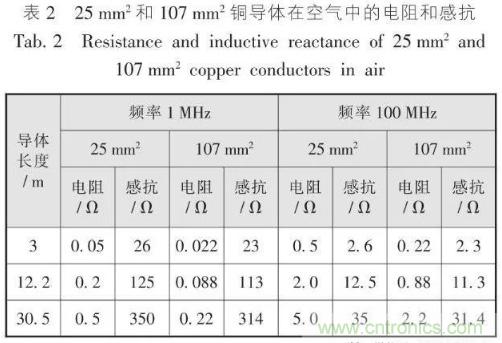 表2是電阻及電抗隨工作頻率變化而變化的關(guān)系。由表2可知:對(duì)于同一截面(如25 mm2)的銅導(dǎo)體在高頻1 MHz時(shí),其感抗量為電阻量的625倍;頻率為100 MHz時(shí),兩者的倍數(shù)高達(dá)6 250。當(dāng)導(dǎo)體截面增大為107 mm2、頻率為1 MHz時(shí),其感抗量為電阻量的1 284倍;頻率為100 MHz時(shí),兩者的倍數(shù)高達(dá)12 840。