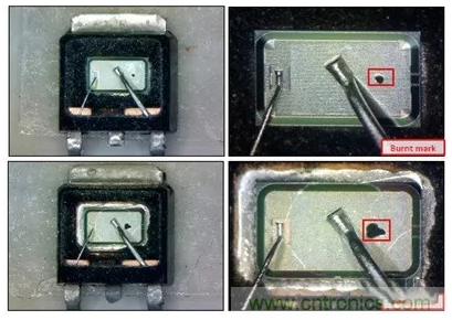 從失效的圖片,可以明顯的看到,功率MOSFET進(jìn)入線性區(qū)失效。