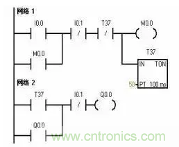 1.延時(shí)啟動(dòng)控制 設(shè)計(jì)延時(shí)啟動(dòng)程序,要利用中間繼電器(內(nèi)部存儲(chǔ)器M)的自鎖狀態(tài)使定時(shí)器能連續(xù)計(jì)時(shí)。定時(shí)時(shí)間到,其常開(kāi)觸點(diǎn)動(dòng)作,使Q0.0動(dòng)作。