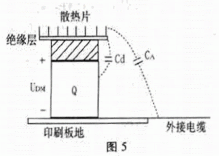 圖5是電壓驅(qū)動模式的一個實例。圖中Q是大功率的開關(guān)管,Q可看成是差模電壓源UDM,共模電流ICM的途徑是由Q通過開關(guān)管和散熱片之間的分布電容Cd到達散熱片,散熱片是共模天線的一個極。然后以空間位移電流的形式,即通過C A到達外部接線,外部接線是天線的另一個極,共模電流再由印制板地回到Q。