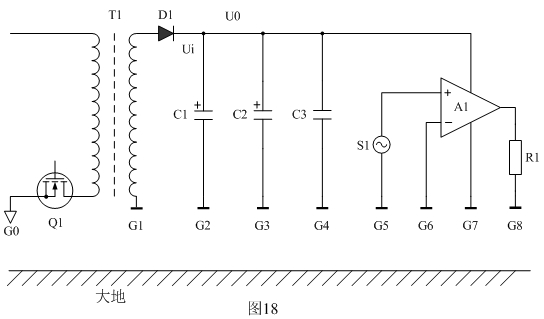 下面我們以圖18為例來(lái)分析地線(xiàn)對(duì)EMC產(chǎn)生的影響。圖18中Q1表示開(kāi)關(guān)電源,T1為開(kāi)關(guān)變壓器,D1為整流二極管,C1、C2、C3為濾波電容器,A1為功率放大器,S1為功率放大器輸入信號(hào),R1為功率放大器輸出負(fù)載,G1、G2、G3、G4、G5、G6、G7、G8為各個(gè)器件的地;Ui表示整流輸出電壓,Uo表示經(jīng)過(guò)濾波后的輸出電壓。