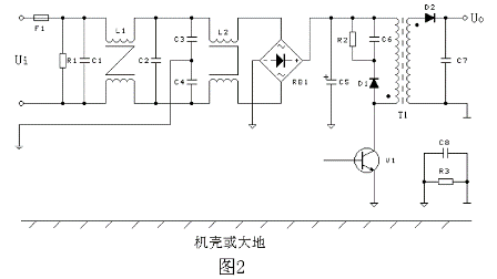 圖1 是一個普遍應用的反激式(或稱為回掃式)開關(guān)電源工作原理圖,50Hz 或60Hz 交流電網(wǎng)電壓首先經(jīng)整流堆整流,并向儲能濾波電容器C5 充電,然后向變壓器T1與開關(guān)管V1組成的負載回路供電。圖2 是進行過電磁兼容設(shè)計后的電原理圖。
