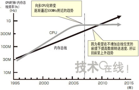 其原動(dòng)力毋庸置疑是CPU的進(jìn)步(即計(jì)算機(jī)系統(tǒng)的大規(guī)模化和時(shí)鐘的高速化)。車載導(dǎo)航儀的CPU時(shí)鐘和內(nèi)存總線時(shí)鐘頻率近來得到了快速提高(圖4)。CPU時(shí)鐘頻率正在逼近上限,今后,提高性能可能要依賴在一個(gè)LSI內(nèi)配置多個(gè)CPU的多CPU化進(jìn)程。而另一方面,DRAM的內(nèi)存總線還在以不增加位寬的前提下提高性能,因此,時(shí)鐘頻率的上升勢(shì)不可擋。