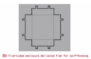 當(dāng)測(cè)試后才進(jìn)行腔體安裝,或PCB板的產(chǎn)量很大時(shí),選擇五面腔體更節(jié)省成本。這種選擇能通過(guò)焊接管腳,點(diǎn)焊角或?qū)附菍?shí)現(xiàn),也可通過(guò)熱回流孔完成加工安裝。迄今為止開(kāi)發(fā)五面腔體和進(jìn)行少量生產(chǎn)最省錢的方法是選用曲線加工五面腔體。如圖5所示,它是通過(guò)在平板上加標(biāo)識(shí)完成。當(dāng)將它們安裝在PCB板上時(shí),用戶只需將其折疊成想要的形狀即可。