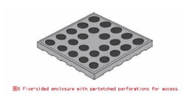有的設(shè)計(jì)者更喜歡用表面安裝生產(chǎn)線的貼裝設(shè)備將蓋子和圍欄合為整體。只有在重新加工腔體內(nèi)元件時(shí)才打開(kāi)蓋子。選擇這種設(shè)計(jì)意味著蓋子上必須留有陣列小孔,以便熱量能進(jìn)入腔體將內(nèi)部的電子元件焊接在PCB上,如圖4所示。不幸的是,這些小孔會(huì)將腔體的屏蔽性能降低20dB左右。