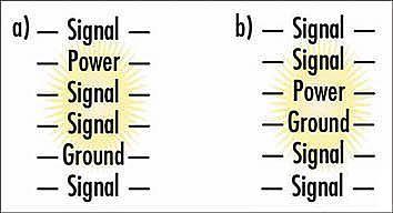 如果4層板上的元件密度比較大,則最好采用6層板。但是,6層板設(shè)計(jì)中某些疊層方案對(duì)電磁場(chǎng)的屏蔽作用不夠好,對(duì)電源匯流排瞬態(tài)信號(hào)的降低作用甚微。下面討論兩個(gè)實(shí)例。