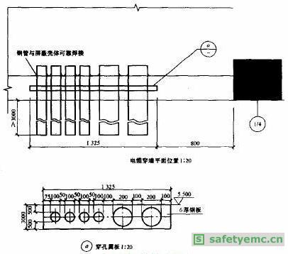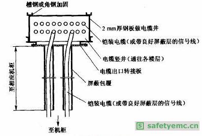 (3)電纜豎井處的電纜進(jìn)出由于電纜豎井是作為同一個(gè)屏蔽區(qū)域,從電纜豎井至各層機(jī)房(非屏蔽區(qū))的管線處理也非常重要。做法如圖2所示