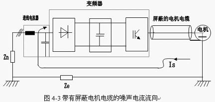 使用屏蔽電機(jī)電纜:對(duì)于高頻干擾,如果高次諧波干擾電流Is有一條合理的通道,則高頻干擾是可以得到抑制的。如果使用非屏蔽電纜,則高次干擾諧波電流Is以一個(gè)不確定的路線流回變頻器,并在此回路中產(chǎn)生高頻分量壓降,影響干擾其它設(shè)備。為使高次諧波干擾電流Is能沿確定路線流回變頻器,需要采用屏蔽電機(jī)電纜(如圖4-3所示)。電纜屏蔽層必須連接到變頻器外殼和電機(jī)外殼上,當(dāng)高次諧波干擾電流Is必須回變頻器時(shí),屏蔽層形成一條有效的通道。這樣,高次諧波干擾電流就不會(huì)在Ze上產(chǎn)生壓降,在Zn上的壓降可由進(jìn)線電抗干擾濾波器來抑制(如圖4-2中的F12)。