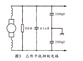 此外,還有一組典型的△形干擾抑制器電路,可同時(shí)抑制對(duì)稱和不對(duì)稱干擾。其具體電路如圖3所示。