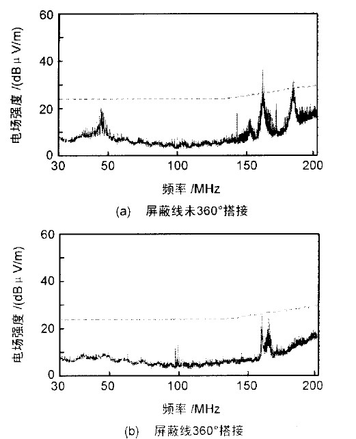 減小空間輻射測(cè)試曲線(xiàn)如圖4 所示。圖4(a)是一臺(tái)外接屏蔽電纜的設(shè)備的測(cè)試曲線(xiàn),電纜與接口連接器相連的地方都是將屏蔽層擰成一條小辮(又稱(chēng)Pigtail),然后固定到連接器的螺釘上。屏蔽電纜能控制共模輻射是因?yàn)楣材k娏魈峁┝艘粋€(gè)低阻抗通路,使共模電流通過(guò)屏蔽層流回共模電壓源。電纜屏蔽層提供的共模電流通路的阻抗由電纜本身的阻抗及電纜與金屬機(jī)箱之間的搭接阻抗2 部分組成。因?yàn)殡娎|與金屬機(jī)箱之間的搭接阻抗(Pigtail的阻抗)較大,這就使得屏蔽層上形成了一個(gè)較大的共模電壓,在該電壓的驅(qū)動(dòng)下,電纜屏蔽層上會(huì)產(chǎn)生共模電流,因而屏蔽層變成了天線(xiàn)向外輻射。將Pigtail連接改成360 壓接在連接器的金屬外殼上,保證低阻抗搭接,測(cè)試結(jié)果如圖4(b)所示。