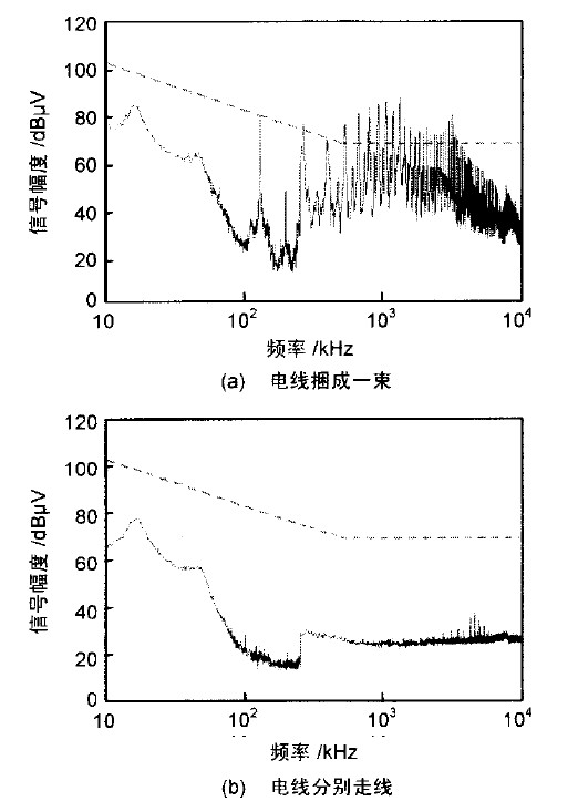 減小電容耦合和互感耦合測(cè)試曲線(xiàn)如圖3 所示。因?yàn)殡娙蓠詈虾突ジ旭詈系拇嬖?,?jīng)常出現(xiàn)圖3(a)這樣的測(cè)試結(jié)果。這是因?yàn)殡娫淳€(xiàn)濾波器的輸入輸出線(xiàn)捆成一束,濾波器輸出線(xiàn)上的雜波電流直接通過(guò)電容和互感耦合到輸入線(xiàn)上,使濾波器形同虛設(shè)。解決這一問(wèn)題只需將濾波器的輸入輸出線(xiàn)分別截短并盡可能遠(yuǎn)離,保持一定角度,并將線(xiàn)固定在機(jī)箱殼體上,這樣就使得輸入線(xiàn)輸出線(xiàn)上的干擾電流不能直接耦合,電源線(xiàn)經(jīng)過(guò)濾波器后干擾電流得到抑制。