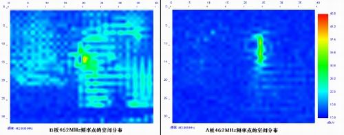 從空間圖中可以看出A板的總的電磁干擾分布區(qū)域比B板的小得多。再來看看某一個頻率點的電磁干擾分布情況。從圖8所示的462MHz這一個頻率點的電磁干擾分布情況來看,A板的幅度小,而且區(qū)域很小。B板的幅度大,而且分布區(qū)域特別廣。