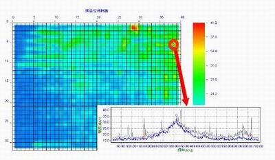 在執(zhí)行頻譜/空間掃描功能時,把工作著的PCB放置到掃描器上,PCB被掃描器的柵格劃分為7.6mm×7.6mm的小格(每個小格含有一個H場探頭),執(zhí)行對每個探頭的全頻段掃描(頻率范圍可以從10kHz-3GHz)后,Emscan最終給出兩張圖,分別為合成頻譜圖(圖1)和合成空間圖(圖2)。