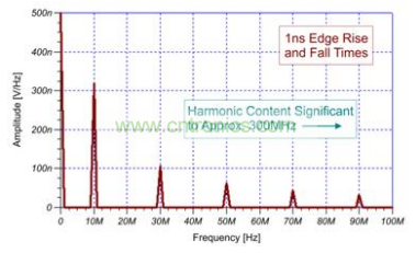10 ns 邊緣率時方程式結(jié)果為約 31.8 MHz。曲線圖顯示,最后一次明顯諧波出現(xiàn)在30 MHz。同時,圖 2 所示 1 ns 邊緣率時方程式結(jié)果為 318 MHz 最大頻率。如果您的電路易受 318 MHz 頻帶內(nèi)產(chǎn)生的頻率影響,則 EMI 諧波可能會使您的電路出現(xiàn)干擾。