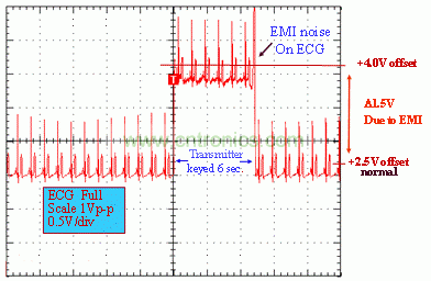 圖 1 1.5 英尺以外的發(fā)射器(f = 470 MHz, P= 0.5W)開啟和關(guān)閉時(shí) ECG 診斷設(shè)備的心臟檢查結(jié)果