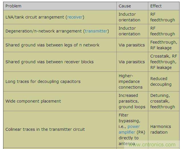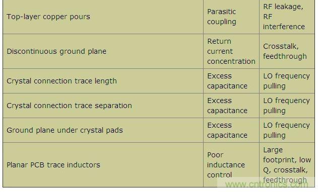 本文羅列了各種不同的設計疏忽,探討了每種失誤導致電路故障的原因,并給出了如何避免這些設計缺陷的建議。本文以FR-4電介質、厚度0.0625in的雙層PCB為例,電路板底層接地。工作頻率介于315MHz到915MHz之間的不同頻段,Tx和Rx功率介于-120dBm至+13dBm之間。表1列出了一些可能出現(xiàn)的PCB布局問題、原因及其影響。