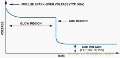 圖9顯示GDT的典型特性。當(dāng)GDT兩端的電壓增大時,放電管中的氣體由于產(chǎn)生的電荷開始電離。這稱為輝光區(qū)。在此區(qū)域中,增加的電流將產(chǎn)生雪崩效應(yīng),將GDT轉(zhuǎn)換為虛擬短路,允許電流通過器件。在短路事件中,器件兩端產(chǎn)生的電壓稱為弧電壓。輝光區(qū)和電弧區(qū)之間的轉(zhuǎn)換時間主要取決于器件的物理特性。