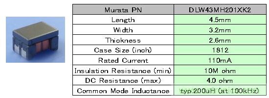 此外,村田公司目前正在開發(fā)作為車載Ethernet用共模扼流圈的DLW43MH系列。該產品的外觀以及主要特性如圖4所示。DLW43MH系列的尺寸和DLW43SH系列同為4.5×3.2×2.6mm,共模電感值提高到了200μH,因此在較寬的頻帶中能起到有效的噪聲對策效果。由于在繞線上下足了功夫并且改善了共模轉差模噪聲,因此噪聲改善效果會更加好。