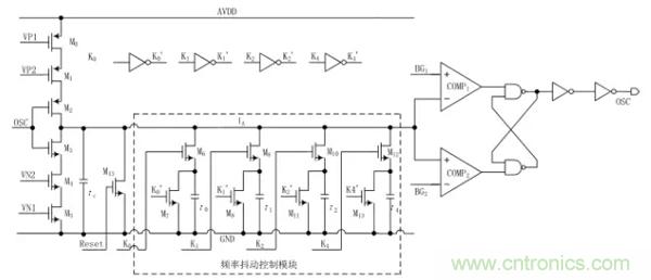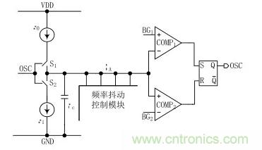 由圖1可以看出,頻率抖動振蕩器由一個(gè)張弛振蕩器加上一個(gè)頻率抖動模塊構(gòu)成。其工作原理:首先,開關(guān) S1閉合,電流源 I0給電容 Cc充電,充電剛開始時(shí)電容 Cc上極板的電壓小于 BG1和 BG2,RS 觸發(fā)器的輸出被置為低電平 0,當(dāng)電容上極板電壓 VA大于 BG2時(shí),RS 觸發(fā)器的輸出狀態(tài)處于保持狀態(tài),直到上極板電壓 VA大于 BG1之后 RS 觸發(fā)器的輸出翻轉(zhuǎn)被置為高電平1;此時(shí),開關(guān) S2導(dǎo)通,電流源 I1給電容Cc放電,當(dāng)VA減小到小于 BG1時(shí),RS 觸發(fā)器的輸出處于保持狀態(tài),當(dāng)VA減小到小于 BG2時(shí),RS 觸發(fā)器翻轉(zhuǎn)被置為低電平 0 ;于是,開關(guān) S1又閉合開始對 Cc充電,如此周而復(fù)始,得到一個(gè)頻率固定的振蕩器。圖1中的電流源I0、 I1的電流相等,則振蕩器的占空比為 0.5。頻率抖動控制模塊是通過計(jì)數(shù)器來周期性的切換加入到張弛振蕩器中充放電電容的大小,改變電壓 VA的充放電速度,從而來達(dá)到周期性的改變振蕩器頻率的目的,即實(shí)現(xiàn)了振蕩器頻率的抖動。