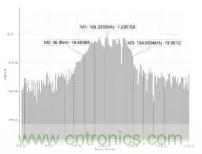 圖 6、圖 7 分別為對不加頻率抖動和加了頻率抖動進(jìn)行傅里葉分析的頻譜圖,對比圖 6 和圖 7 可以看出加了頻率抖動電路之后在固定頻率處的頻譜幅值下降了大約11 dB,由此可見頻率抖動電路對減小 EMI 的效果非常明顯。