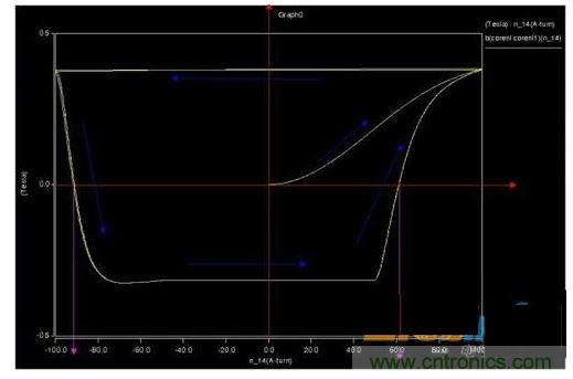 2、仿真CCM模式,磁滯回線上會出現(xiàn)兩個安匝跳變位置,但是磁通密度并不能跳變,而是通過下降來釋放能量。