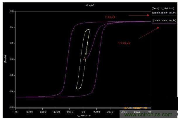這個時候磁滯回線變成了樣子?注意看100A/m,-100A/m,50A/m,-50A/m 這幾個轉(zhuǎn)折點。