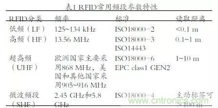 在應(yīng)用方面,低頻和高頻的電子標簽,讀取距離較短、數(shù)據(jù)量少,因此適合用于近距離的識別。超高頻系統(tǒng)由于具有不同的電磁感應(yīng)方式,讀寫器和標簽的讀取距離可>10 m,數(shù)據(jù)速率可達640 kbps。RIFD常用頻段參數(shù)特性,見表1。