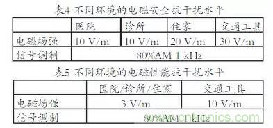 在過去關(guān)于醫(yī)療設(shè)備抗電磁干擾的標準中,往往僅考慮醫(yī)療設(shè)備在醫(yī)院內(nèi)的使用情況。但隨著科技的發(fā)展,許多設(shè)備逐漸變得輕巧、簡便,方便患者在各個地點使用,特別是一些便攜式、植入式及可穿戴的醫(yī)療設(shè)備。例如植入式的心臟起搏器,要保證在各種場所能正常安全地工作,不會被其他電子發(fā)射信號或設(shè)備干擾。因此IEC60601-1-4《醫(yī)用電氣設(shè)備第1-4部分:基本安全和必要性能的通用要求:電磁干擾的測試和要求》,提出了電磁環(huán)境的分類以及如何根據(jù)環(huán)境來合理地確定抗干擾水平。在這版標準中,強調(diào)了不同的電磁環(huán)境,分別是醫(yī)院、診所、住家、交通工具。不同環(huán)境中的醫(yī)療設(shè)備所需的抗干擾水平,見表4~5。