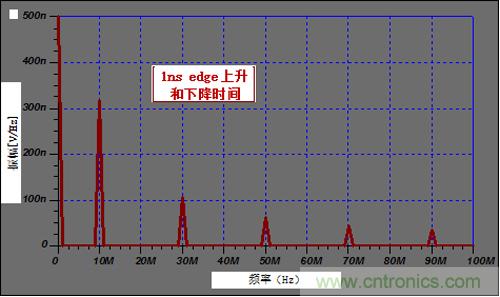 根據(jù)該公式,10nsEdge Rate對應(yīng)的諧波頻率大約為31.8MHz。圖3顯示:最后一個重要的諧波頻率為30MHZ。同時,1ns的Edge Rate對應(yīng)的諧波頻率318MHZ(圖2)。如果頻率范圍擴(kuò)展到300MHZ以外,顯示的諧波仍很明顯,但卻在相關(guān)頻率上迅速變小。