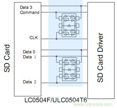 SD卡重點(diǎn)保護(hù)data數(shù)據(jù)線(xiàn)和CLK,要確保選擇的ESD器件是低容值和小封裝的產(chǎn)品:LC0504F SOT-563