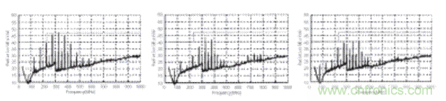 下面是上述三種情況對應的EMI測試結果。結果是磁珠A和磁珠B都會對EMI噪聲產(chǎn)生很大的衰減。磁珠A在整個EMI頻譜范圍內的衰減要稍好于磁珠B。