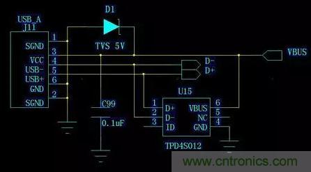 對外接口的信號線同樣需要保護(hù),否則靜電經(jīng)過信號線直接到達(dá)芯片IO管腳,雖然芯片的IO都有二極管保護(hù),一般可以抵御+-2KV的靜電,但是對于+-6KV的ESD接觸放電,就會(huì)遭遇損壞的風(fēng)險(xiǎn)。同樣是USB接口,如圖2.1,差分信號線D+和D-接了個(gè)ESD器件TPD4S012,實(shí)際上是與USB電源和地并接反向二極管,把電流導(dǎo)向USB電源或者地。