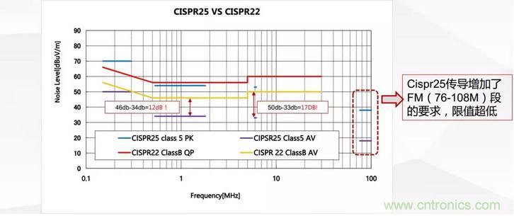 歷史上普遍接受的國際電磁干擾標(biāo)準(zhǔn)是CISPR-22,美國的電磁干擾標(biāo)準(zhǔn)是FCC,CISPR-22與FCC有所不同,但一般來說如果電源符合CISPR-22標(biāo)準(zhǔn),那么它也符合FCC標(biāo)準(zhǔn)。總之CISPR-22標(biāo)準(zhǔn)已經(jīng)成為全世界都遵守的基本標(biāo)準(zhǔn)。汽車上的電磁干擾標(biāo)準(zhǔn)是CISPR-25,相對(duì)CISPR22來說CISPR-25標(biāo)準(zhǔn)限制值更低并且額外對(duì)FM頻段做了很嚴(yán)的限制要求。具體傳導(dǎo)測(cè)試限制要求如圖2所示。