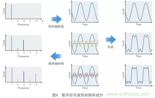 在我學生時代碰到的噪聲中,計算機的時鐘頻率約為4MHz。但是,例如在日本,用于調頻廣播的頻段為76MHz或更高。噪聲源的時鐘頻率不會與廣播頻率重疊。那問題為什么會出現(xiàn)呢?數(shù)字信號是由基波正弦波和其整數(shù)倍的諧波組成的方波,如圖A所示。方波的上升越急劇,其包含的高次諧波分量越高。這意味著實際的數(shù)字信號具有與調頻廣播頻帶重疊的諧波分量,從而導致調頻收音機的聲音中產生噪聲。