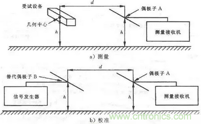 測試距離d雖然沒有明確要求,但最好還應(yīng)符合遠(yuǎn)場條件。d的起始點為EUT的幾何中心,終止點為測量天線A的天線中心。替代試驗和校準(zhǔn)試驗時,替代天線B應(yīng)置于EUT 的幾何中心。