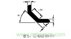 與過(guò)孔相似,直角的轉(zhuǎn)彎路徑應(yīng)該被避免,因?yàn)樗趦?nèi)部的邊緣能產(chǎn)生集中的電場(chǎng)。該場(chǎng)能耦合較強(qiáng)噪聲到相鄰路徑,因此,當(dāng)轉(zhuǎn)動(dòng)路徑時(shí)全部的直角路徑應(yīng)該采用45度。圖5是45度路徑的一般規(guī)則。